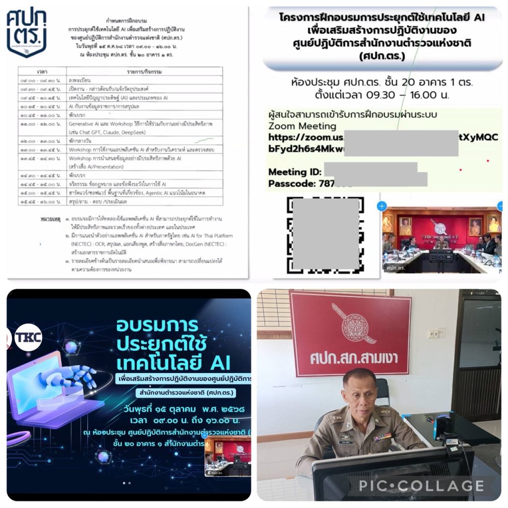 วันนี้ 15 ต.ค.2568 เวลา 09.30 น.พ.ต.อ.ธนกฤต ธนาพงศ์ศักดา ผกก.สภ.สามเงา ได้มอบหมายให้ พ.ต.ต.โกศล พุดซ้อน สว.อก.สภ.สามเงา เข้าอบรมตามโครงการฝึกอบรม “การประยุกต์ใช้เทคโนโลยี AI เพื่อเสริมสร้างการปฏิบัติงานของ ศปก.ตร.”ในวันพุธที่ 15 ต.ค.68 ตั้งแต่เวลา 09.30-16.00 น. ผ่านสื่ออิเล็กทรอนิกส์ระบบ Zoom Meeting ณ ศปก.สภ.สามเงา จว.ตาก