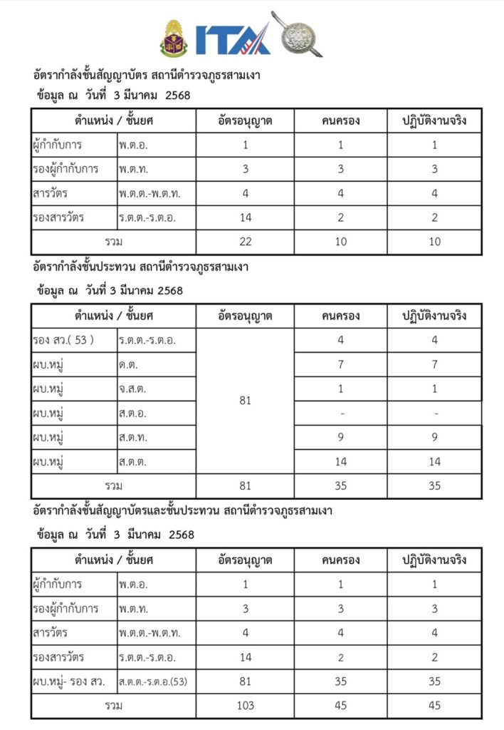 ข้อมูลอัตรากำลังสถานีตำรวจภูธรสามเงา